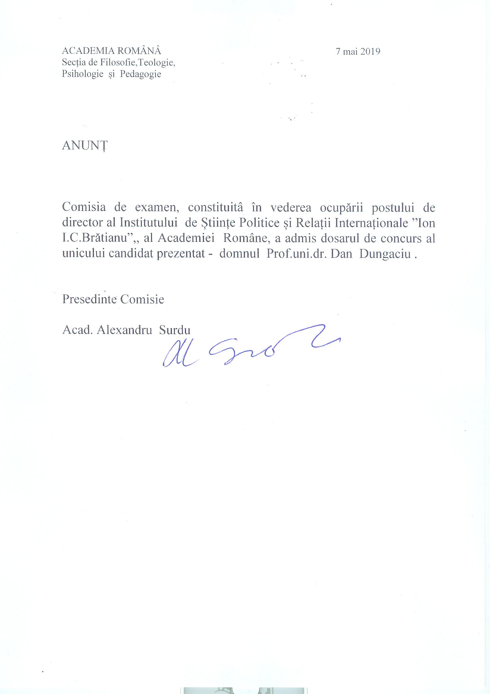 Anunț admitere dosar de concurs